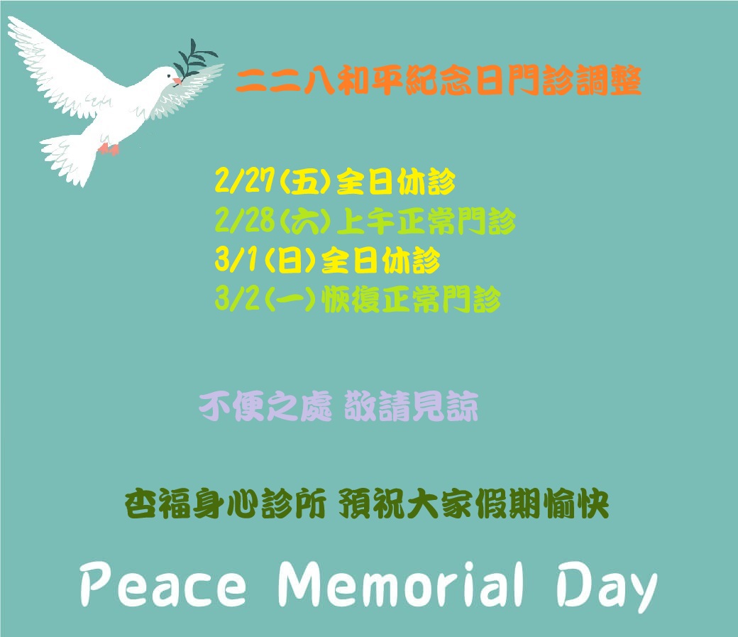 二二八和平紀念日門診調整 2/27(五)全日休診 2/28(六)上午正常門診