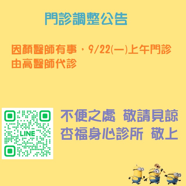 門診調整公告 因顏醫師有事,9/22(一)上午門診由高醫師代診