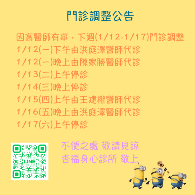 門診調整公告 因高醫師有事,下週(1/12-1/17)門診調整